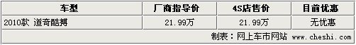 據4S店銷售人員介紹:目前2010款道奇酷搏北京地區(qū)無現(xiàn)車,但部分4S店內接受預訂,定金為5000元。據經銷商介紹,2010款酷搏計劃將在第二季度引入中國,但最早可能在3月份到店銷售。2010款酷搏仍將搭載2.0升自然吸氣發(fā)動機,在配置上將與08款車型相差不多,相比09款車型配置更豐富;此款車型售價為21.99萬元,在價格方面與老款車型持平。
