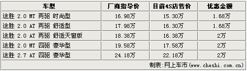 北京現(xiàn)代途勝是韓系車中非常經(jīng)典的一款城市型SUV,寬大的空間,時(shí)尚的外觀以及人性化的配置使眾多消費(fèi)者都鐘情它。據(jù)網(wǎng)上車市價(jià)格監(jiān)測(cè)系統(tǒng)顯示:目前購(gòu)買途勝的消費(fèi)者最高可享受到2萬(wàn)元的現(xiàn)金優(yōu)惠。具體車型見下表: