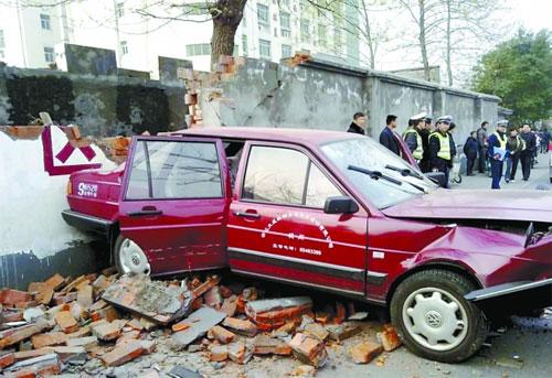 駕校訓(xùn)練場(chǎng)與路面落差有2米多高,這輛教練車接連沖破了圍欄、隔離墩和圍墻。 網(wǎng)友 王梓媽 本報(bào)記者 董旭明 攝