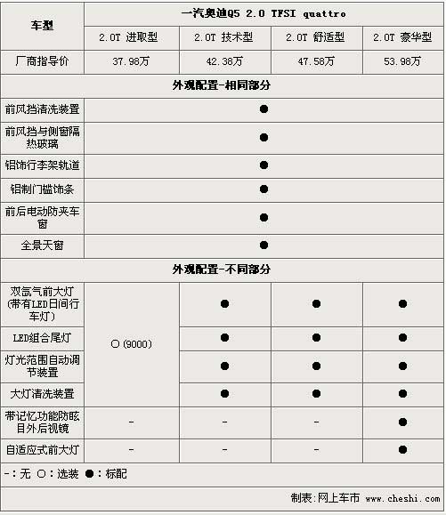 國產(chǎn)奧迪Q5全系均安裝了全景天窗,在車型均安裝了鋁飾行李架軌道,并且前風(fēng)擋以及側(cè)窗都安裝了帶有隔熱功能的吸能玻璃,愛美的女車主可以不必在為了怕曬黑自己,而涂上厚厚一層的防曬霜了。除了入門級的進(jìn)取型之外,其他三款車型均安裝了帶有LED日間行車燈的雙氙氣前大燈,并且?guī)в星按鬅羟逑垂δ,LED尾燈也安裝上身。雖然進(jìn)取型沒有標(biāo)配這些配置,不過只要您愿意,花費(fèi)9000元這些配置同樣可以選裝上身。頂配的豪華版車型上,自適應(yīng)式前大燈可以比其他三款車型給駕駛員提供更人性化更廣闊的視野范圍。