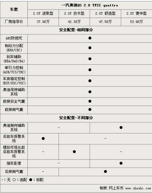 在主動安全與輔助安全性方面,ABS防抱死系統(tǒng)、制動力分配、剎車輔助、動態(tài)車身穩(wěn)定系統(tǒng)等主動安全設(shè)備都被配備在了全系車型身上,奧迪保持輔助系統(tǒng)則可以在您偏離行駛軌道時,通過方向盤的震動向駕駛員提醒車輛脫離行駛車道。前排安全氣囊以及前排側(cè)氣囊兩項(xiàng)輔助安全配置也全系安裝上身,而在進(jìn)取型上則取消了后排側(cè)安全氣囊。4款車型在駐車提示方面配置差異較大,進(jìn)取型采用了傳統(tǒng)的雷達(dá)探頭報(bào)警系統(tǒng),技術(shù)型采用的是模擬可視化前后駐車報(bào)警系統(tǒng),而舒適型以及豪華型則安裝了更加直觀的倒車影像。