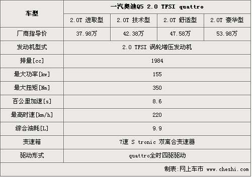 國產(chǎn)奧迪Q5搭載了大眾EA888系列的2.0TFSI渦輪直噴發(fā)動機,經(jīng)過重新調校后,此款發(fā)動機的最大功率為155kw,而在1500-4200轉可以爆發(fā)出350Nm的最大扭矩。奧迪Q5采用了7速 S tronic 雙離合變速器,此款變速器既充滿手動變速箱的駕駛樂趣,同時又融合自動變速器便捷操作的變速器,換擋的頓挫感更小,平順性也更好,再配上奧迪的quattro全時四驅驅動方式,奧迪Q5被打造成了真正的一款注重性能的SUV車型。
