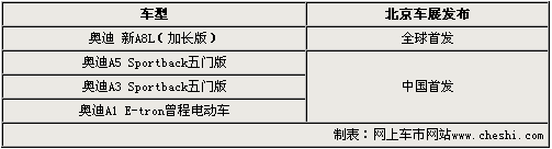 奧迪新一代A8車型雖然已于去年底正式發(fā)布,但其為中國(guó)消費(fèi)者量身訂做的加長(zhǎng)版-新A8L將在國(guó)人面前全球首發(fā)。奧迪A5 Sportback五門(mén)版、奧迪A3 Sportback五門(mén)版車型,將于今年正式以進(jìn)口身份引入國(guó)內(nèi)。而奧迪A1 E-tron曾程電動(dòng)車作為一款節(jié)能減排的概念車,將向人們展示其獨(dú)特的性能和環(huán)保技術(shù)。