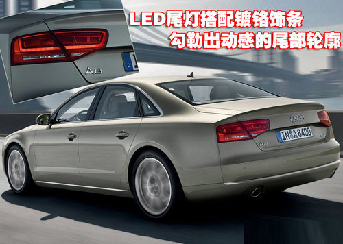 通過(guò)奧迪新A8車型的尾部可以看出,全新的LED分體式尾燈搭配全新后保險(xiǎn)杠的鍍鉻裝飾條,勾勒出其充滿活力與動(dòng)感的尾部輪廓。