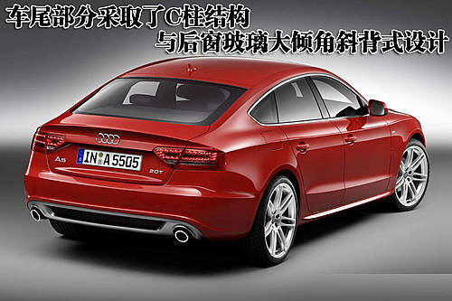 奧迪A5 Sportback四門轎跑車除加長軸距以外,依然延續(xù)奧迪A5雙門轎跑版的大部分車身結(jié)構(gòu)。不過在車尾部分采取了對C柱結(jié)構(gòu)與后窗玻璃改動最小的大傾角斜背式設(shè)計(jì),增加了實(shí)用性。