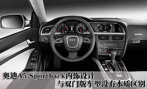 奧迪A5 Sportback四門(mén)轎跑車(chē)擁有與奧迪A系家族車(chē)型一致的內(nèi)飾設(shè)計(jì),最大的區(qū)別在于車(chē)廂布局上。銀白色的金屬裝飾條和黑色防反光儀表板,突出時(shí)尚與動(dòng)感的視覺(jué)效果,甚至在車(chē)頂和座椅的色彩選擇上都采用了冷酷的黑色。