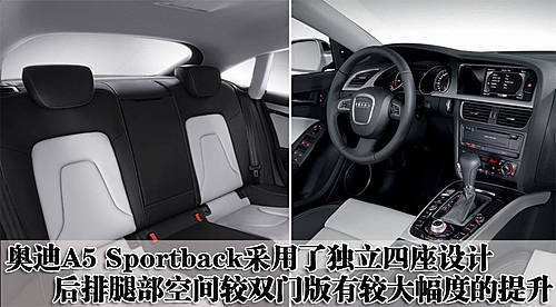 與很多四門(mén)轎跑車(chē)一樣,奧迪A5 Sportback四門(mén)轎跑車(chē)采用了獨(dú)立四座設(shè)計(jì),前排提供運(yùn)動(dòng)座椅等選裝配置,后排空間尤其是腿部空間表現(xiàn)較雙門(mén)轎跑定位的奧迪A5有較大幅度的提升。