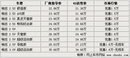豐田銳志作為一款以運(yùn)動(dòng)著稱的后驅(qū)中級車,在性能以及操控各方面表現(xiàn)都令人滿意,尤其是獨(dú)具個(gè)性的改裝潛力,讓很多癡迷運(yùn)動(dòng)的車迷們找到了充分的駕 駛樂趣。銳志配備有2.5L和3.0L兩種排量的發(fā)動(dòng)機(jī),同時(shí)超長的軸距設(shè)計(jì)讓乘員的空間也有了非常理想的狀態(tài)。近日根據(jù)網(wǎng)上車市價(jià)格監(jiān)測系統(tǒng)顯示,目前 購買銳志車型,最高可享受到1.8萬元的現(xiàn)金優(yōu)惠。具體車型見下表:
