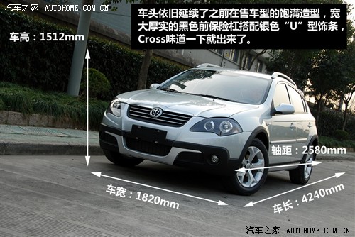 駿捷Cross的車身尺寸為4240mm×1820mm×1512mm,軸距依然為2580mm,與原型車駿捷FRV相比,除了底盤(pán)升高了20mm之外,中華駿捷Cross加裝了前后大包圍,標(biāo)配的全鋁制車頂行李架和蜂窩狀的進(jìn)氣格柵增加了動(dòng)感和活力,輪轂由FRV的15寸升級(jí)為16寸的鋁合金輪轂,在增強(qiáng)視覺(jué)效果的同時(shí),也使檔次得到一定提高。