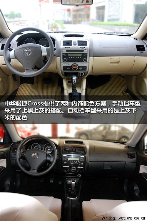 與個(gè)性的外觀相比,駿捷Cross在內(nèi)飾上似乎并沒(méi)有體現(xiàn)出什么特點(diǎn),呈現(xiàn)的一派典型的轎車化風(fēng)格,做工在自主品牌里面算是比較出色的,而且樣式也絕對(duì)不亞于同價(jià)位的合資車型,其中手動(dòng)擋車型采用的是上黑下灰的配色方案,而自動(dòng)擋車型則為更接近結(jié)局的上灰下米的色彩搭配。