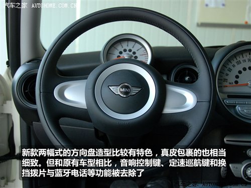 此外,兩輻式的方向盤造型改變對于熟悉MINI的人來說就需要時(shí)間去適應(yīng)了,造型的改變和價(jià)格沒什么直接的關(guān)系,關(guān)鍵在于多功能按鍵也隨之消失了,原來的音響調(diào)節(jié)、定速巡航和車載電話功能都不再能看到?吹竭@里你可別不高興,要知道這些都有裝備的車型就不是這個(gè)價(jià)了,要30萬以上才行。