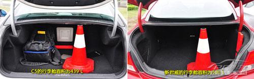 在車身尺寸方面新君威比C5車身長度和高度數(shù)據(jù)要好一些,分別多出25mm和26mm。而軸距上C5卻要長出新君威78mm,也比新君威寬了4mm,在同級車里面也拿得出手,在實際體驗中,C5的后排頭部空間受益于內(nèi)凹處理方式以增加頭部空間,顯得很充裕,所以無論是商用還是家用空間完全夠用,腿部空間也夠用,而新君威由于軸距較短且是運動化的定位,后排空間表現(xiàn)并不理想,腿部空間只能說夠用,且頭部空間則略顯局促。