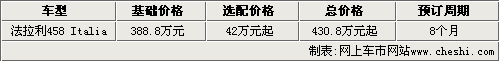 據(jù)法拉利北京展廳銷售人員介紹,目前法拉利458 Italia已經(jīng)有展車抵達展廳,消費者可隨時到店看車。而且法拉利458 Italia已經(jīng)開始接受預訂,起價為388.8萬元,消費者如果預定這款新車,至少要選裝42萬元的配置,總價格為430.8萬元起。另外,消費者如果現(xiàn)在下訂單的話,需要在明年1月份才能提到現(xiàn)車。