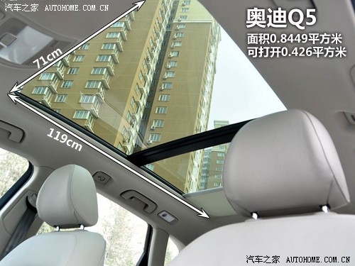奧迪Q5熱度不減,自上市以來持續(xù)加價售車,不過我們今天不關心它什么時候停止加價,只來看看它的全景天窗是否夠吸引人。應該說,跟其他幾款同級別的車型相比,Q5的天窗看起來要更加美觀,因為它沒有用一根過于明顯的橫梁將天窗一分為二,雖然說后半部分也并不能打開,但至少視覺上沒有阻隔感,整體性要更強。