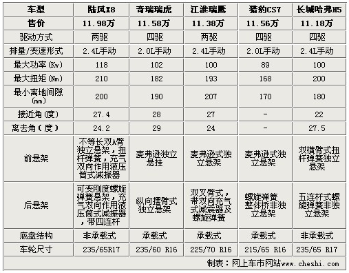 首先,作為一款SUV,人們除了關(guān)注他們的基本信息外,更看重的就是它實(shí)際的通過(guò)性和操控性。通過(guò)上表我們可以看到,除了獵豹CS7,其他4款車(chē)型的離地間隙都處于一個(gè)比較優(yōu)秀的水平上,這為人們?nèi)粘3鲂薪加危樌ㄟ^(guò)略微惡略的路況提供了保障。另外,值得一提的就是5款SUV的底盤(pán)結(jié)構(gòu),瑞虎、瑞鷹和CS7三款都采用了中規(guī)中矩的承載式設(shè)計(jì),而陸風(fēng)X8和哈弗H5則采用了純正的越野車(chē)底盤(pán)設(shè)計(jì)-非承載式,讓車(chē)輛在越野路況也可以更順暢的通過(guò)。