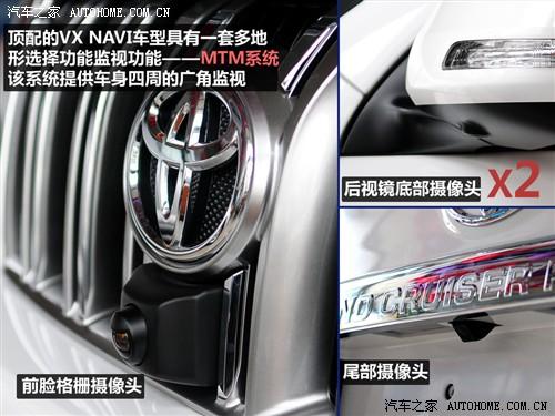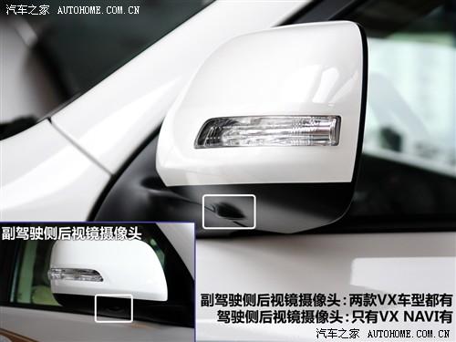 配置上的區(qū)別首先在前臉格柵就能發(fā)現(xiàn),因?yàn)樵谲嚇?biāo)下面隱藏了一個(gè)攝像頭,而這在低配車型上是沒(méi)有的,與之搭配的是正副駕駛后視鏡下面和車輛尾部也各有一個(gè)攝像頭,四個(gè)攝像頭組成了VX NAVI車型的“MTM多地形選擇功能監(jiān)視系統(tǒng)”。VX車型則沒(méi)有正駕駛后視鏡上的攝像頭。