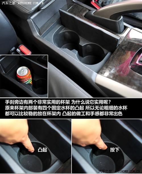 手剎邊上的杯架做工非常不錯(cuò),內(nèi)部帶有彈性的卡扣,各種粗細(xì)大小的水杯都可以比較穩(wěn)的放在其中。而扶手箱下的儲(chǔ)物盒雖然深度一般,但是內(nèi)部的空調(diào)出風(fēng)口大大增加了它的實(shí)用性,兩個(gè)帶有空調(diào)出風(fēng)口的儲(chǔ)物空間是車內(nèi)絕對(duì)的亮點(diǎn)。