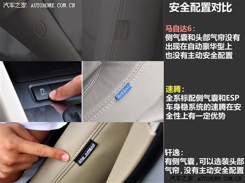對(duì)比配置,我們先從安全性配置開始,在這方面,無疑速騰是最大的贏家,因?yàn)轳R自達(dá)6除了最基本的ABS+EBD和雙氣囊之外,沒有別的更多安全配置;而速騰是全系標(biāo)配ESP和側(cè)氣囊的;軒逸盡管主動(dòng)安全配置沒什么亮點(diǎn),但這款高配車型有側(cè)氣囊,而且可以選裝頭部氣簾,所以還是比馬自達(dá)6更勝一籌。