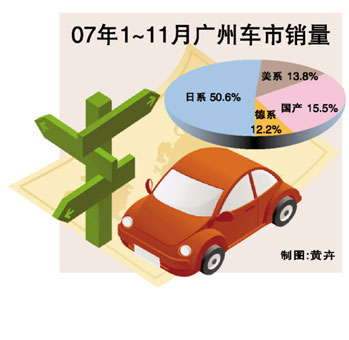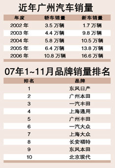 根據(jù)記者掌握的權威數(shù)據(jù),廣州汽車(轎車)市場2007年1~11月總銷量達到10.69萬輛,全年則超過12萬輛大關。