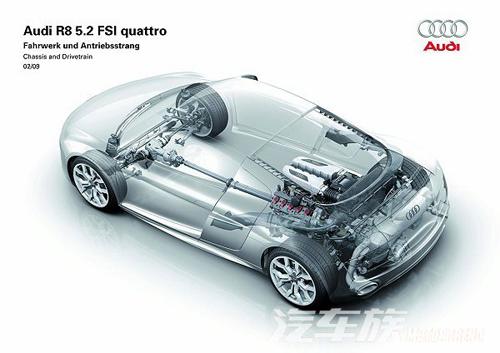 除了具有強(qiáng)悍的動力心臟,R8 5.2 FSI quattro依照慣例的以輕量化鋁合金材質(zhì)打造車體,單就車體部分僅有210kg,使得車重僅有1620kg,經(jīng)過計(jì)算,可擁有3.1kg/hp的重量馬力比,可于3.9秒完成起步加速0-100km/h,極速高達(dá)316km/h。由于干式油底殼的設(shè)計(jì),與優(yōu)異的底盤結(jié)構(gòu),使得R8 5.2 FSI quattro可承受最高達(dá)1.2g的側(cè)向g力。