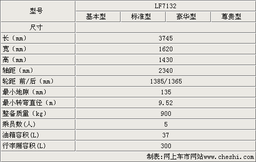 從車型尺寸來(lái)看,力帆320比奇瑞QQ3更長(zhǎng)、更寬,2340mm的軸距也與奇瑞QQ3保持一致。力帆320的整備質(zhì)量只有900kg,離地間隙為135mm,車身比較輕,穩(wěn)定性也比較好。這款車的后備箱容積達(dá)到300升,放倒后排座椅以后,后備箱還有擴(kuò)展的空間。