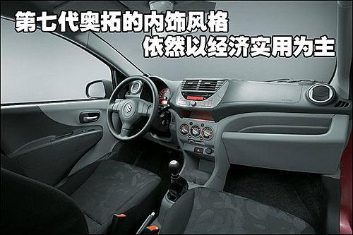 在內(nèi)飾方面,第七代奧拓依然以經(jīng)濟(jì)實用為主,而且采用深淺雙色設(shè)計,使內(nèi)飾風(fēng)格并不單一。在配置方面,我們可以看到,全新奧拓只采用手動調(diào)節(jié)空調(diào)和織布座椅等簡單功能性配置。另外,這款車型的中控臺及手套箱傾斜角度較大,這樣可以加大腿部的空間。