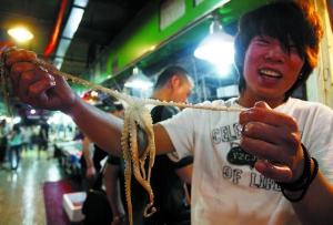 記者昨日來到京深海鮮市場,發(fā)現(xiàn)很多攤位都出售章魚,活章魚價(jià)格每斤30元左右,死章魚每斤15元左右。據(jù)一家攤主介紹,自從世界杯捧火了章魚保羅后,最近總有客人來詢問是否有章魚賣。原來市場里僅有兩三家賣章魚的,而世界杯后,不少攤位都增加了章魚生意。