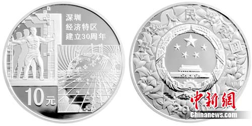 中國(guó)人民銀行今天向海內(nèi)外公開(kāi)發(fā)行深圳經(jīng)濟(jì)特區(qū)建立30周年金銀紀(jì)念幣一套。該套紀(jì)念幣共2枚,其中1/4盎司金幣1枚,1盎司銀幣1枚,均為中華人民共和國(guó)法定貨幣。