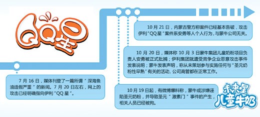 21日,內(nèi)蒙古警方就有人在網(wǎng)絡(luò)媒體發(fā)帖損害伊利商譽(yù)案做出通報(bào),稱案件已經(jīng)基本告破,攻擊伊利“QQ星”案件系蒙!拔磥(lái)星”品牌經(jīng)理安勇等人的個(gè)人行為,與蒙牛公司沒有關(guān)系。