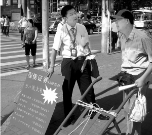 男子胳膊上挎著一個紅色拎包,里面裝滿資料和表格,他手拿一份資料,逢人便攔,以這些價格不菲的禮品誘惑他們停下腳步,聽他把開戶炒股的好處一一道來。心動的路人不多,無奈之下,他連手推兩輪車忙著送貨的人也不錯過。昨天,記者從國信證券了解到,由于市場表現(xiàn)不好,的確有很多業(yè)務(wù)員上街送禮促銷,至于送禮價值大小,則由業(yè)務(wù)員自行決定,公司的統(tǒng)一政策是,免除新開戶兩市總計90元的開戶費。