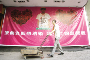 “潦倒老板想結(jié)婚,哪個紅娘愿幫我!弊蛉丈衔纾粔K印有征婚內(nèi)容的彩色巨大噴繪橫幅驚現(xiàn)渝北區(qū)兩路一處串串香門面外,橫幅上印有征婚者肖像及聯(lián)系方式,仔細(xì)一看,征婚者身上竟然標(biāo)注為“百萬負(fù)翁”。上前打探得知,原來征婚者就是這家串串香店的老板,由于4年前做生意虧損,欠下上百萬債務(wù),如今他想通過征婚找到另一半與自己共渡難關(guān)。
