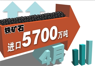 海關(guān)12日公布的數(shù)據(jù)顯示,4月份,我國(guó)鐵礦石進(jìn)口5700萬(wàn)噸,創(chuàng)造了歷史新高。我國(guó)鐵礦石進(jìn)口自1月以來(lái)連續(xù)4個(gè)月攀升,1-4月份合計(jì)進(jìn)口鐵礦石18846萬(wàn)噸,累計(jì)增長(zhǎng)22.9%。