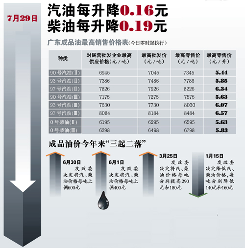 隨后,省物價局根據(jù)國家規(guī)定,也制定公布了廣東省的成品油銷售價格。這也是全省成品油價格繼6月份一個月內(nèi)連續(xù)2次上漲之后,首次出現(xiàn)下調(diào)。降價的幅度從0.16元/升~0.20元/升不等,其中國Ⅲ標準97號汽油降價最多,降價后每升最高零售價為6.57元。