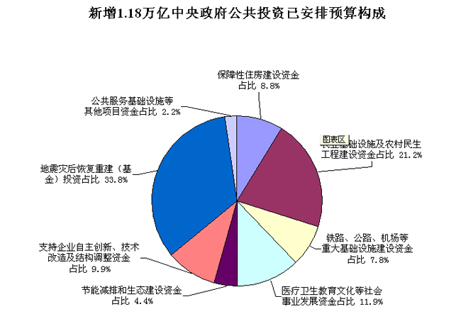 截至目前,1.18萬億元新增中央政府公共投資已安排資金5915億元,分項(xiàng)目情況如下:用于保障性住房建設(shè)資金522億元,占8.8%;農(nóng)業(yè)基礎(chǔ)設(shè)施及農(nóng)村民生工程建設(shè)資金1253億元,占21.2%;鐵路、公路、機(jī)場等重大基礎(chǔ)設(shè)施建設(shè)資金460億元,占7.8%;醫(yī)療衛(wèi)生教育文化等社會事業(yè)發(fā)展資金703億元,占11.9%;節(jié)能減排和生態(tài)建設(shè)資金260億元,占4.4%;支持企業(yè)自主創(chuàng)新、技術(shù)改造及結(jié)構(gòu)調(diào)整資金585億元,占9.9%;地震災(zāi)后恢復(fù)重建(基金)投資2000億元,占33.8%;公共服務(wù)基礎(chǔ)設(shè)施等其他項(xiàng)目資金132億元,占2.2%。