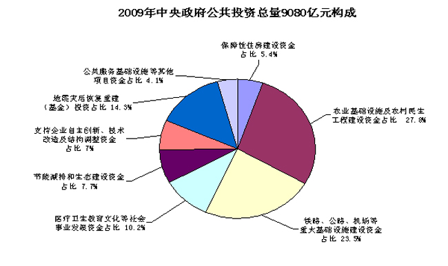 此外,2009年中央政府公共投資預(yù)算總量為9080億元,比上年增加4875億元,分項(xiàng)目安排情況如下:用于保障性住房建設(shè)資金493億元,占5.4%;農(nóng)業(yè)基礎(chǔ)設(shè)施及農(nóng)村民生工程建設(shè)資金2522億元,占27.8%;鐵路、公路、機(jī)場等重大基礎(chǔ)設(shè)施建設(shè)資金2134億元,占23.5%;醫(yī)療衛(wèi)生教育文化等社會事業(yè)發(fā)展資金926億元,占10.2%;節(jié)能減排和生態(tài)建設(shè)資金696億元,占7.7%;支持企業(yè)自主創(chuàng)新、技術(shù)改造及結(jié)構(gòu)調(diào)整資金633億元,占7.0%;地震災(zāi)后恢復(fù)重建(基金)投資1300億元,占14.3%;公共服務(wù)基礎(chǔ)設(shè)施等其他項(xiàng)目資金376億元,占4.1%。