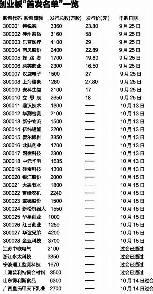 昨天,第三批創(chuàng)業(yè)板企業(yè)再獲IPO批文。華誼兄弟等9家企業(yè)發(fā)布招股意向書,昨天起進(jìn)行網(wǎng)上路演、初步詢價(jià)和現(xiàn)場推介,10月13日確定發(fā)行價(jià)格,10月15日集中申購。自創(chuàng)業(yè)板開閘以來,已有28家企業(yè)相繼進(jìn)入招股程序,掛牌上市指日可待。分析人士指出,這28家公司將是創(chuàng)業(yè)板開市“首發(fā)名單”。