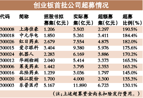 28家已發(fā)行的創(chuàng)業(yè)板公司全部存在超額募集資金現(xiàn)象。28家公司擬募集資金數(shù)量為70.784億元,實際募集資金154.784億元,28家公司合計超募83.184億元,平均每家公司超募2.971億元,這一數(shù)額甚至超過了個別中小板公司的募集資金額。