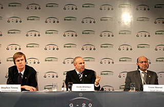 二十國(guó)集團(tuán)財(cái)政部長(zhǎng)和中央銀行行長(zhǎng)(G20)2008年年會(huì)9日在巴西圣保羅閉幕,與會(huì)代表一致認(rèn)為有必要改革目前的國(guó)際金融體系,采取共同行動(dòng)應(yīng)對(duì)全球金融危機(jī)。