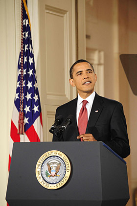 美國(guó)總統(tǒng)貝拉克·奧巴馬9日晚舉行就任以來(lái)首次黃金時(shí)間段新聞發(fā)布會(huì)。