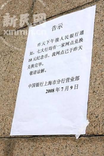 據(jù)悉,在昨天部分銀行網(wǎng)點(diǎn)開放兌換奧運(yùn)紀(jì)念鈔后,今天是滬上各大銀行集中兌換的日子。市民都是得知這一消息后趕來的,其中更有人在昨晚看了新聞后便趕到銀行門口候了一晚。但今天上午7點(diǎn)多,銀行工作人員忽然在門口貼出告示,表示該支行的配額已經(jīng)在之前兌換完畢,讓排隊市民去別家支行兌換。