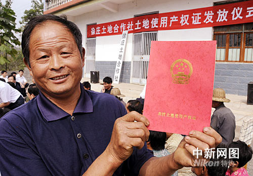 中新網(wǎng)棗莊9月15日電(通訊員 李宗憲)山東省棗莊市山亭區(qū)徐莊鎮(zhèn)的280名農(nóng)民,于9月15日領(lǐng)到了由山亭區(qū)人民政府發(fā)放的農(nóng)村土地使用產(chǎn)權(quán)證。據(jù)悉,由地方政府向農(nóng)民發(fā)放農(nóng)村土地使用產(chǎn)權(quán)證在全國尚屬首次。