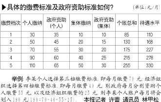最低的個(gè)人繳費(fèi)標(biāo)準(zhǔn)確定為30元,以20元為級(jí)差,向上設(shè)立五個(gè)檔次的繳費(fèi)標(biāo)準(zhǔn),最高一檔為110元。參保農(nóng)民可根據(jù)各自的經(jīng)濟(jì)承受能力自愿選擇一檔繳費(fèi),多繳多得!掇k法》對(duì)經(jīng)濟(jì)組織設(shè)計(jì)了5個(gè)檔次的繳費(fèi)標(biāo)準(zhǔn),從10元至50元不等;對(duì)于確無(wú)經(jīng)濟(jì)能力的經(jīng)濟(jì)組織,也可以暫不為參保人繳費(fèi)。