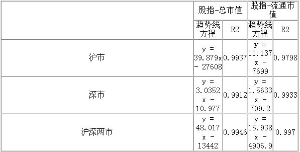 表3 三個股指與相應市值的趨勢線方程及相關系數(shù)