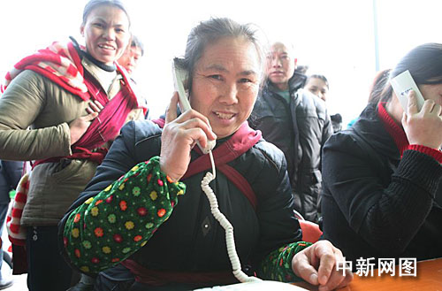 這位民工朋友告訴記者,這是他這幾天來第一次給家里打電話。由于這幾天杭州、湖南、安徽等地下大雪,火車或晚點或停開,他和許多同鄉(xiāng)一樣滯留在火車站,手機早沒電了!岸嗵澯辛穗娦诺拿赓M電話,才跟家里聯(lián)系上,報個平安,免得他們擔心,你看他們都跟我一樣在報平安。”他指著排在旁邊一長溜的旅客說。