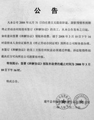 此后,遂平華強(qiáng)門(mén)口又張貼出公告,特別提示簽署《和解協(xié)議》領(lǐng)取補(bǔ)助費(fèi)的截止時(shí)間為2008年3月10日。