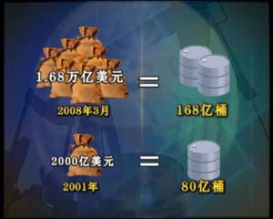 盡管高油價給美國本國也帶來影響,但譚雅玲認為在美國的策略組合當中,美元貶值可以化解他國內(nèi)石油價格上漲帶來的負面壓力,但是對其他國家的影響則全然不同,2001年,中國官方外匯儲備達2000億美元,國際石油價格在每桶25美元左右,中國可以購買80億桶;2008年3月,中國官方外匯儲備是世界第一,達到1.68萬億美元,以石油價格100美元計算,中國可以購買168億桶。也就是說,雖然中國外匯儲備增長7倍多,但真實購買力只是原來的1倍。德國經(jīng)濟學家,《石油戰(zhàn)爭》的作者威廉恩道爾在接受本欄目記者電話采訪時直接指出。
