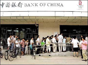 市民王先生說,前天,他在報紙上看到中國人民銀行將于昨天發(fā)行10元奧運紀(jì)念鈔,因為想到中國銀行是奧運會合作伙伴,昨天一大早,他就趕到中行知春路支行等候購買奧運紀(jì)念鈔。當(dāng)王先生到達(dá)銀行門口時,近300名市民早已在此排起長隊。