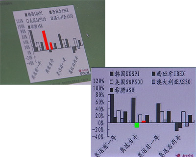 記者注意到,奧運(yùn)召開的當(dāng)年,韓國和美國的股市都有大幅上漲的表現(xiàn),但與此相反的是,西班牙和澳大利亞的股市卻是下跌或持平,那么,同為奧運(yùn)舉辦的國家,股市的表現(xiàn)為什么卻截然相反?