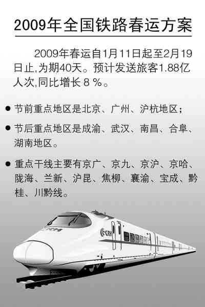 鐵道部8日宣布,2009年全國(guó)鐵路春運(yùn)自1月11日起至2月19日止,為期40天,其中春節(jié)前15天,節(jié)后25天。
