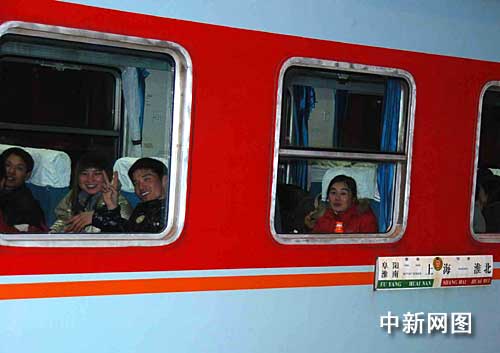 據(jù)杭州鐵路公安局馬警官介紹,這春運第一車是由杭州開往阜陽的,但由于是一趟臨時加班車,所以車身上依然掛的是上海到淮北的牌子。同時該車乘務員告訴記者,該車在加了車廂后,現(xiàn)在共有17節(jié)車廂,而從杭州站上車的旅客就有1800多人,超員已在百人以上了!17節(jié)肯定是不夠的,路上過站還得有人要上,可現(xiàn)在光杭州首發(fā)站,就連餐車里都坐滿了人,前面還有幾節(jié)車廂還有好多沒座票的人站著呢。”馬警官指著餐車車廂說道。(完)